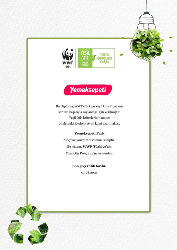 Yemeksepeti, merkez binası Yemeksepeti Park’ta uygulamaya koyduğu çevreci dönüşümle, WWF-Türkiye (Doğal Hayatı Koruma Vakfı) “Yeşil Ofis Diploması”nı almaya hak kazandı. WWF-Türkiye Yeşil Ofis Diploması, Yemeksepeti’nin sürdürülebilir bir geleceğe yönelik kararlılığını tescilledi. Yenilikçi ve sürdürülebilir uygulamalarıyla sektöründe öncü olan Yemeksepeti’nin çevreci inovasyonlarına bir onay da WWF-Türkiye’den Yeşil Ofis Diploması ile gelmiş oldu.